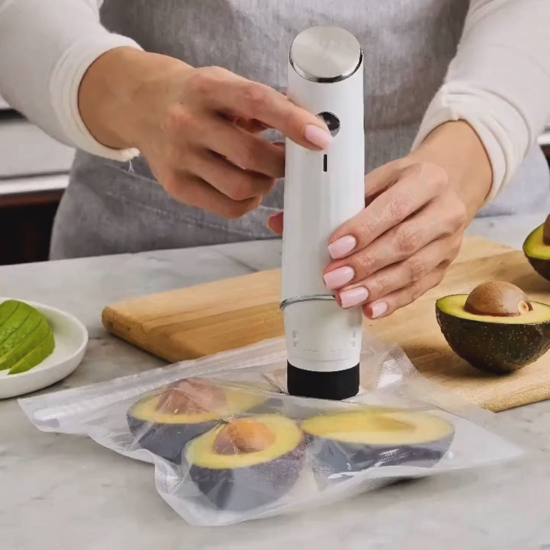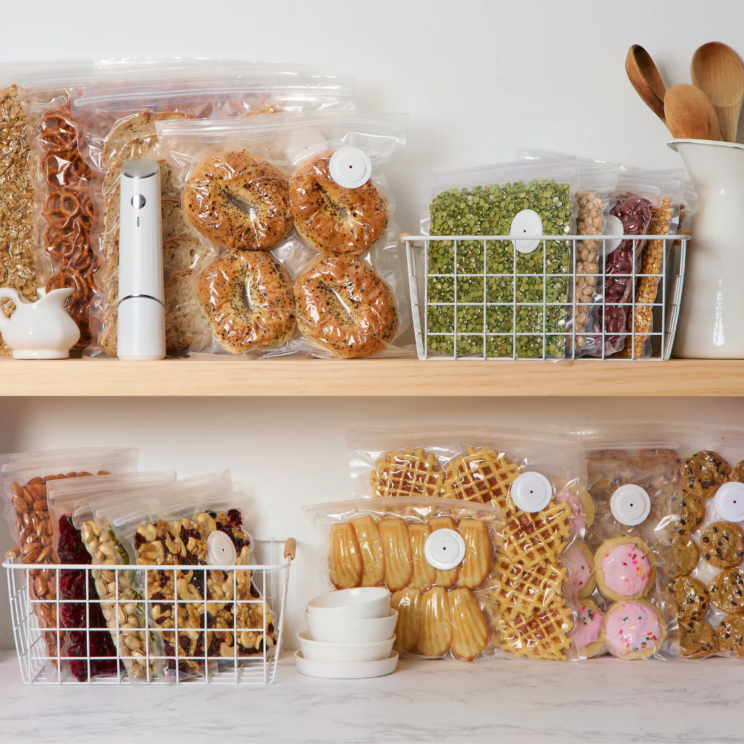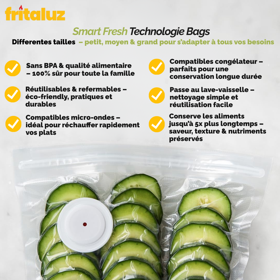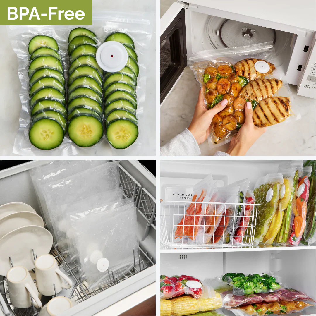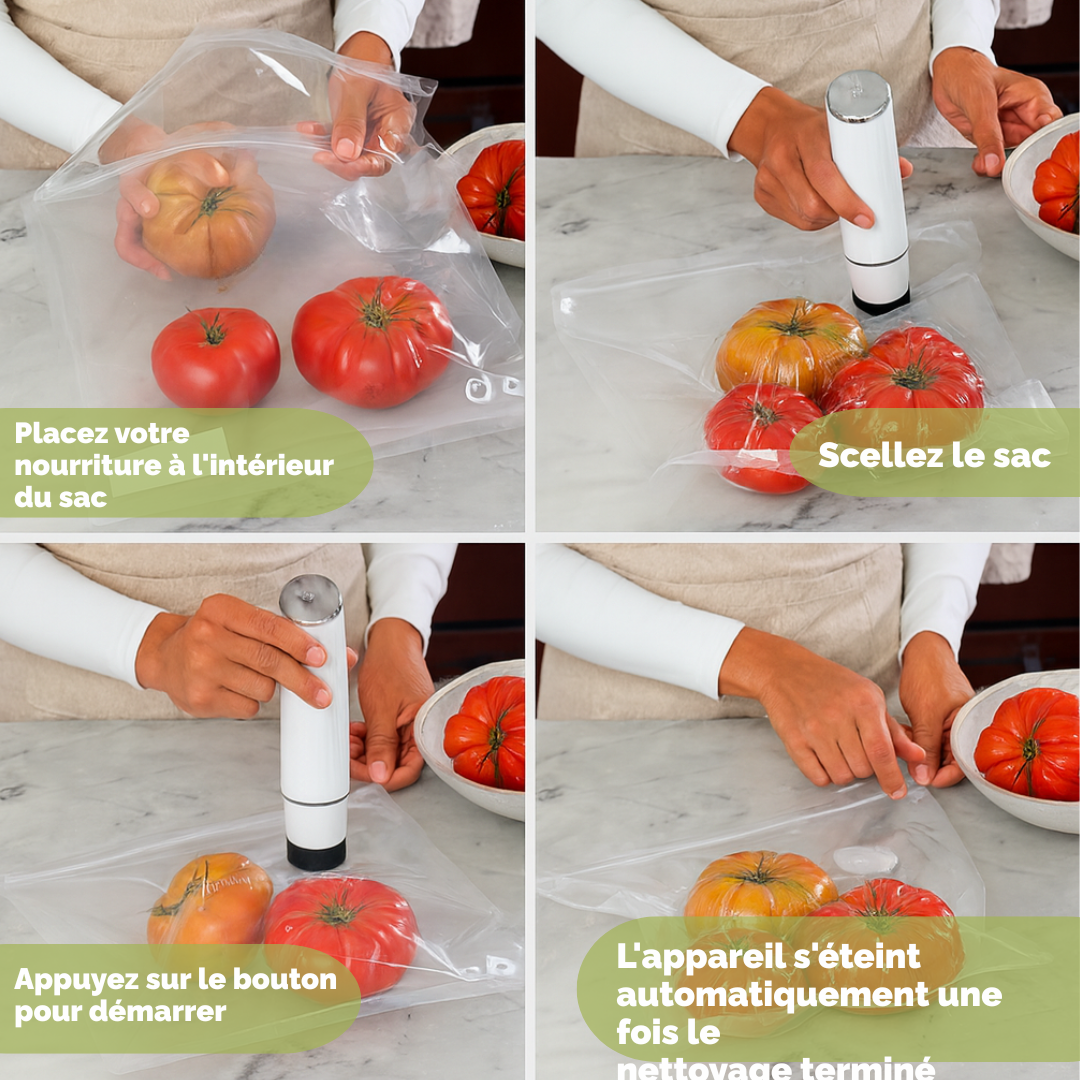 FreshVacuum® est compact, silencieux et efficace en 5 secondes — avec des sacs sans BPA, réutilisables et durables qui conservent vos aliments jusqu’à 5x plus longtemps.